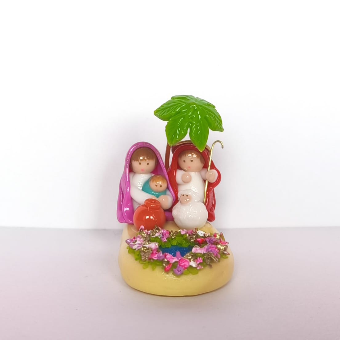 Este encantador pesebre en miniatura representa la Sagrada Familia frente a un oasis adornado con un árbol y pequeñas flores. Elaborado en cerámica y pintado a mano, combina tradición y alegría navideña en una pieza llena de ternura y detalle. Ideal para decorar espacios pequeños o regalar en la temporada festiva, evocando el espíritu de amor y unión familiar.